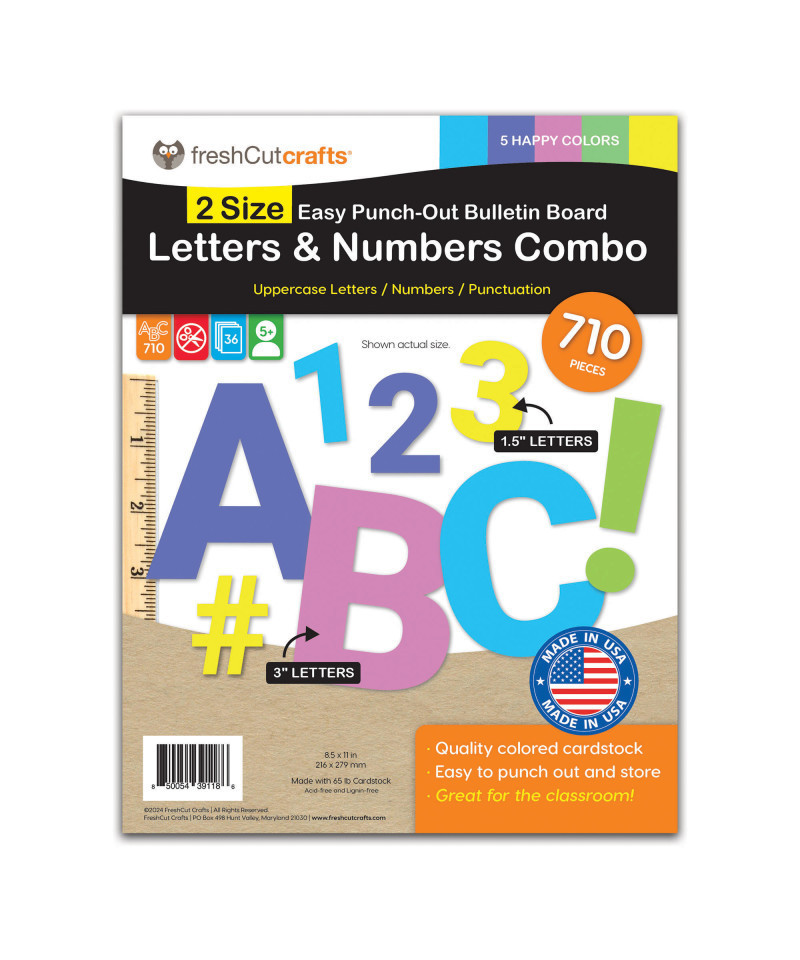 Get our two most popular letter sizes in one pack with FreshCut Crafts Letters & Numbers Happy Combo Pack! More sizes mean maximum creativity to make eye-catching, colorful bulletin board designs, posters, and displays. You'll get bright, multicolored, easy alphabet punch-out uppercase letters, numbers, symbols, and punctuation in two popular sizes — 3-inch and 1.5-inch. Colors include bright purple, pink, green, blue, and yellow. SO MANY LETTERS! This 36-sheet pack includes 209 3-inch and 501 1.5-inch letters for a total of 710 pieces in all, made from color-rich, fade-proof quality card stock that offers 2-sided versatility and tons of creative possibilities.