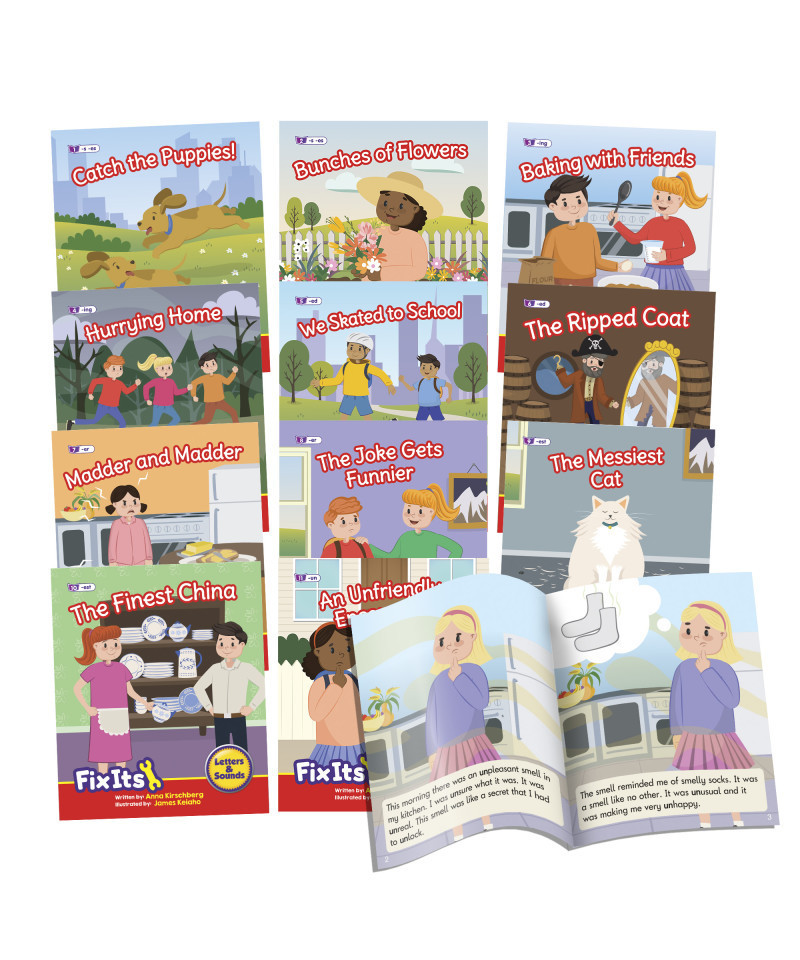 This set of fiction Fix Its decodable readers covers the most common suffixes and prefix -un to meet the requirements of the national curriculum at Year 1. Specifically, the set includes (-s, -es, -ing, -ed, -er, -est and prefix un-). There are two titles for each. Children can identify the target affix in the text quickly as they have been highlighted to consolidate the meaning across different words. Other words included are decodable at the phase level as well as common exception words in accordance to the progression.