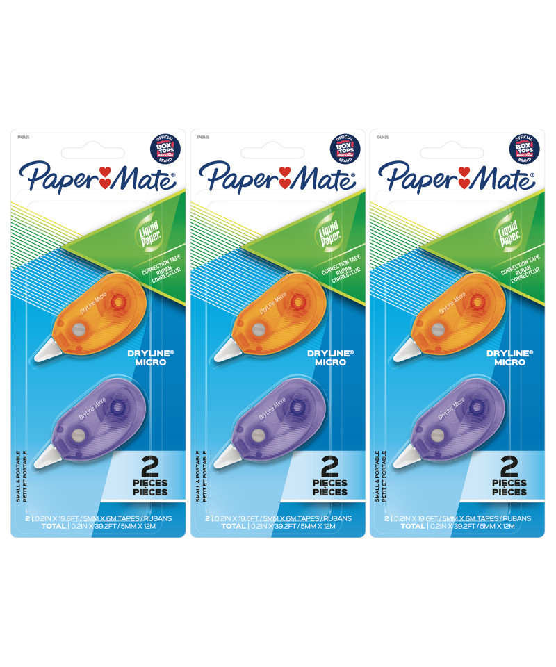Quickly cover your mistakes when you're on-the-go with Liquid Paper DryLine Micro Correction Tape. This correction tape dispenser features a compact design that fits easily into pencil cases, book bags, and many other forms of storage. The tape goes down absolutely smooth and corrects instantly with no mess, so you never need to wait for it to dry before copying, rewriting, or retyping. You will also enjoy an ergonomic shape that fits comfortably in your hand providing a secure hold for added control. And here's a tip for the best corrections: place your paper on a firm, flat surface and slowly roll the applicator over the error using firm, even pressure. Do-overs done right, it's like mistakes were never even there. Each pack includes 2 correction tapes. Sold as 3 packs for a total of 6 correction tapes.