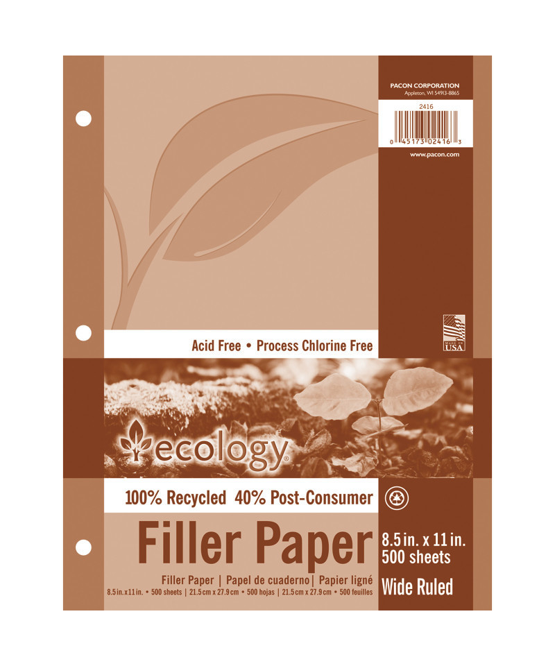 Recycled Filler Paper contains 100% recycled content with 40% post-consumer fiber. An environmentally friendly filler paper that's acid-free and process chlorine free. A great writing paper option for all of your home and classroom needs. Recycled and recyclable. Measures 8-1/2" x 11". Each pack includes 500 sheets.