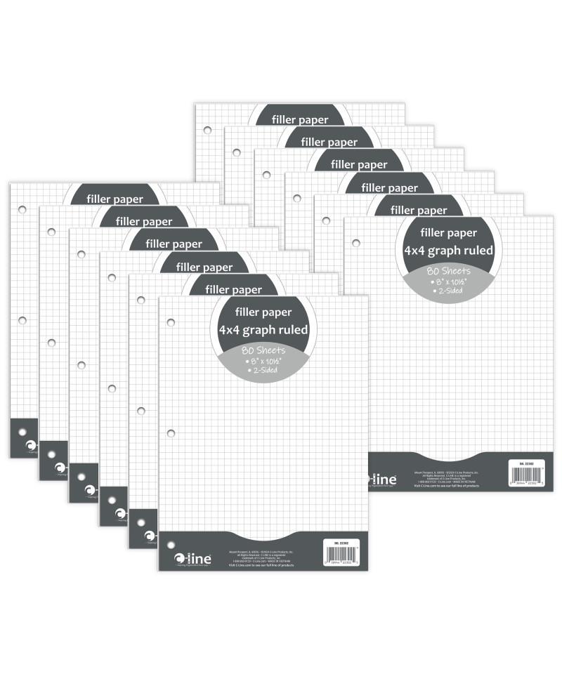 Graph Ruled Filler Paper lets you create graphs, charts, drawings or simply take notes in binders and folders. The 4 x 4 graph ruling provides a guide for your drawings and notetaking. 3-hole punch makes it easy to add paper to standard 3-ring binders. Perfect for students and professionals, these durable pages can be used to draw and record charts, graphs and more. Graph ruled format, bright white paper allows for neat drawing and writing. Pages measure 8" x 10-1/2" in size so they can easily be inserted in all letter-size folders, files, and binders. 3-hole punched for binders. Sold as 12 packs with each pack containing 80 sheets.