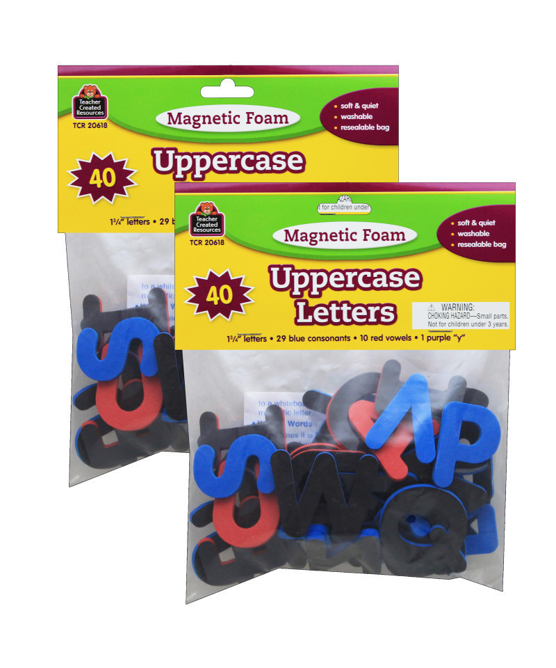 Practice alphabet-related skills with 40 uppercase letters measuring 1-3/4". 27 blue consonants, 12 red vowels, and 1 purple Y. Lightweight, washable foam coupled with magnetic backing makes the letters practical for any setting. Comes in a resealable storage bag. Teaching tips are included. Sold as 2 sets.