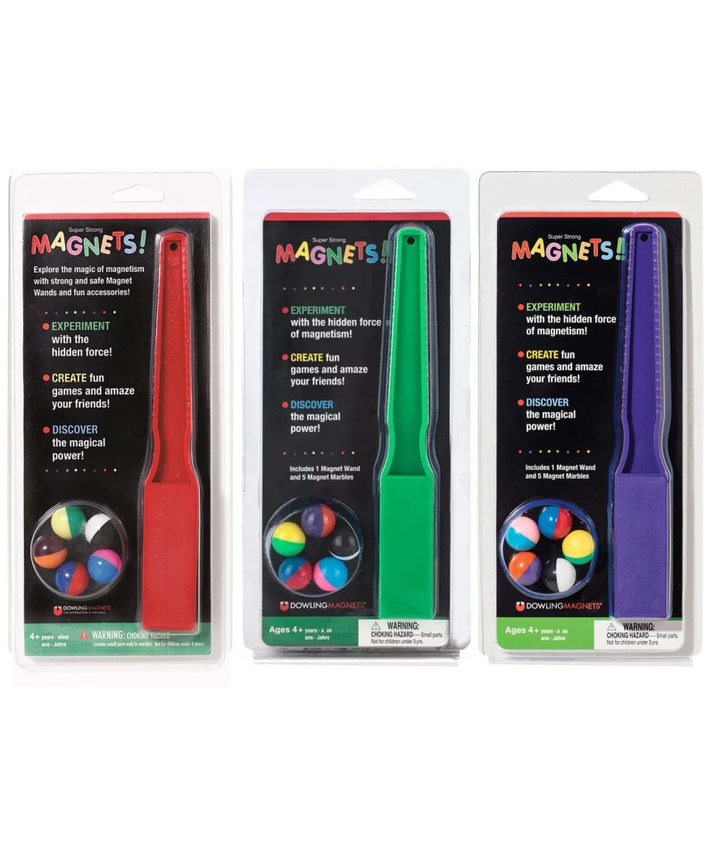 Wave the wand over any object to find out what it attracts! Then experiment, count and sort with magnet marbles. They look like ordinary marbles, but they're magnets too! Build pyramids and other fun shapes, play marble games and more. Mini set includes wand (assorted colors- no color choice) and 5 bicolor magnet marbles to get you started. Wand measures 7.63" L. Ages 4+/Grades PreK+. Sold as 3 sets.