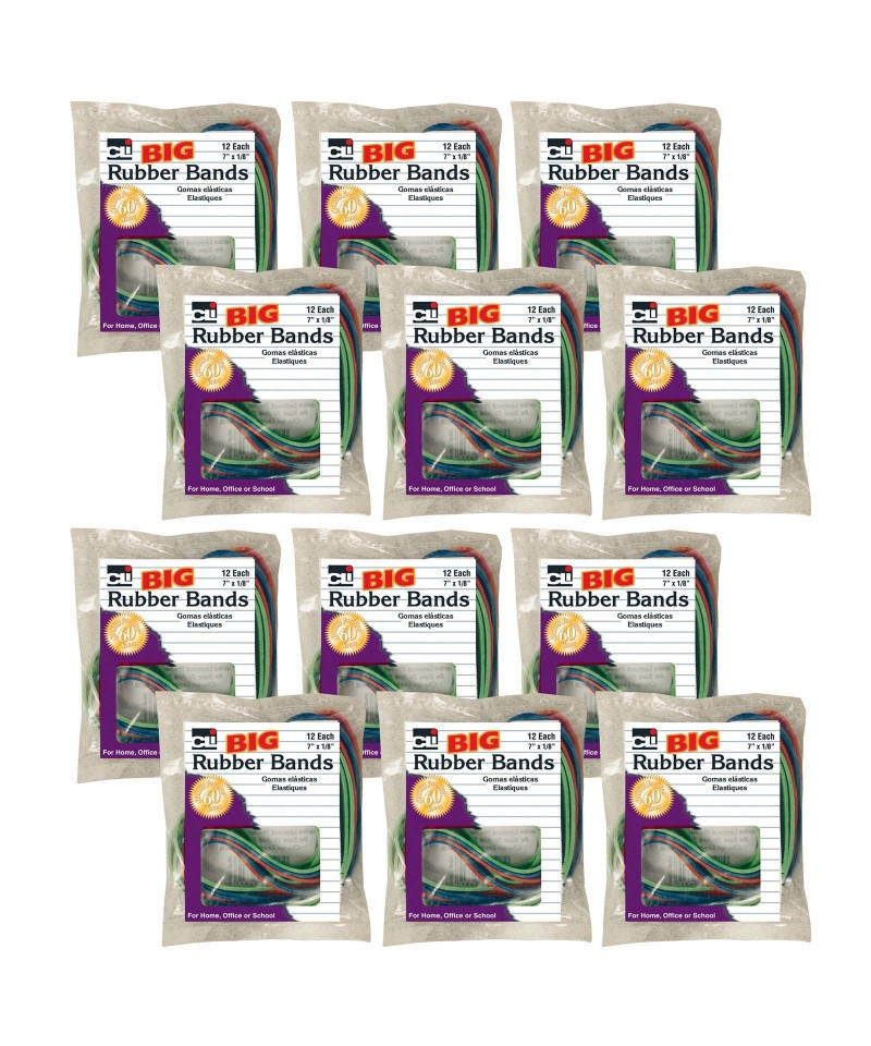High quality bands made from 100% pure rubber. Seamless construction offers greater tensile strength, and durability. Great Quality at a great price. Assorted colors. 12 pack. Sold as set of 12 packs, 144 rubber bands total.