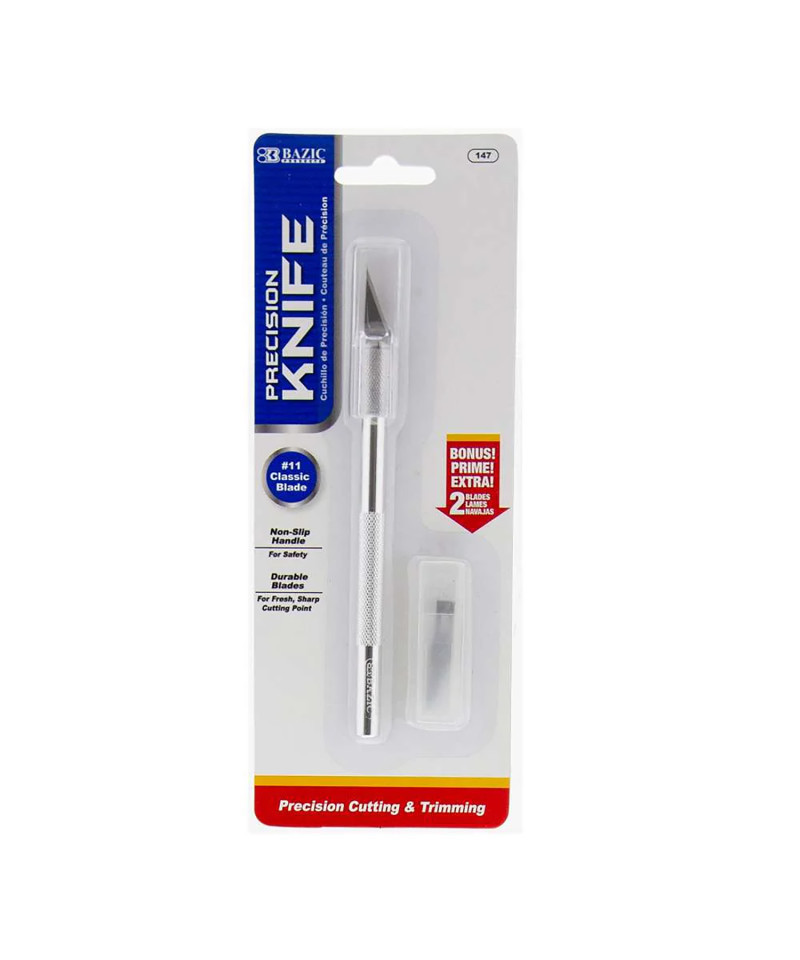 The #11 precise knife is sturdy and strong, featuring stainless steel cutters of high quality and a non-slip handle. It cuts sharp and is resistant to rust. Each pack includes a bonus of two extra blades. The knife measures 5.5" long. Professional box knives ensure strength and maximum productivity, boasting solid metal handles and textured grips to reduce fatigue. They offer more precision and smooth control, furnished with one cutter. Loading the next razor is easy, ensuring you always work with the sharpest edge. Suitable for office, home, hobby, artist, and designer use, they are ideal for delicate artwork projects, models, precision cutting, detailing, and trimming. They are adept at cutting moving boxes, cartons, leather, cardboard, fabric, rubber, poster board, or DIY school projects. Additionally, they feature a safety cap to cover the blade, preventing unnecessary cuts, and are convenient for storage and portability to meet your project needs.