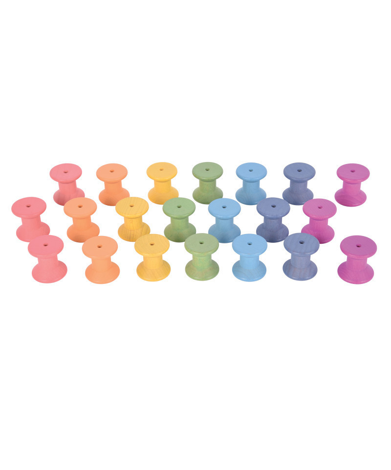 - INCLUDES 21 WOODEN SPOOLS -- This natural set includes 21 Beech wood spools in 7 colors: red, orange, yellow, green, dark blue, light blue and purple. There are 3 spools of each color for stacking, sorting and sequencing activities.