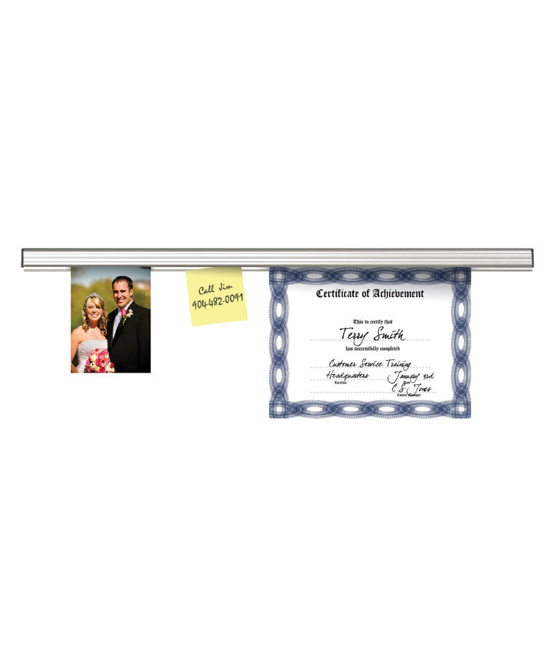 This convenient and durable display system uses a system of interlocking rollers to adapt to various thicknesses of paper, posters, and other items up to .125" thick. The best solution for communicating ideas while displaying a variety of visual aids for commercial, personal, and professional use. Grip-A-Strip eliminates the need for hazardous tacks and pins and includes mounting tape and brackets, allowing you to mount it almost anywhere. Clean satin aluminum finish for a sleek, professional look.