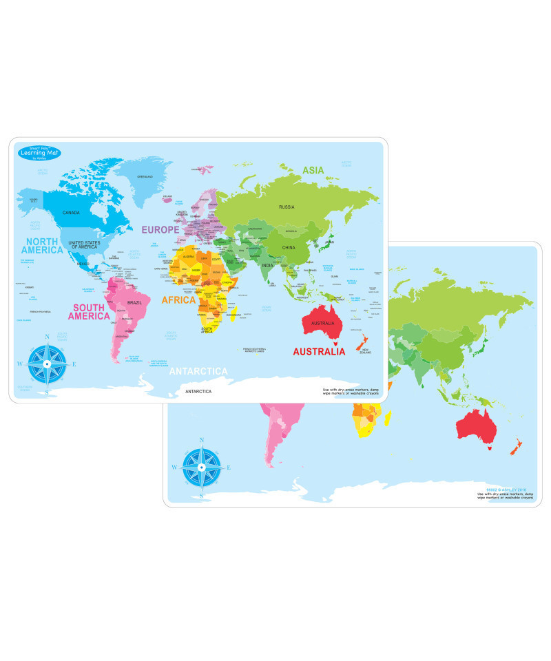 Smart Poly™ material has been designed for the classroom and home. The material is strong, durable, water resistant, and does not need lamination. Practice learning world geography with the World Basic Map learning mat. Label countries and bodies of water. Heavy duty double-sided surface for fun and colorful learning on both sides. Write-on/wipe-off surface. Use with dry erase or water based markers and washable crayons. Each side is an interactive lesson. Mat measures 12" x 17".