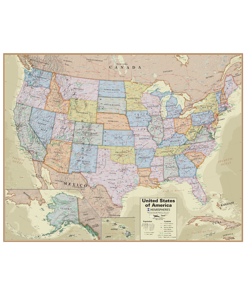The Hemispheres Boardroom USA Wall Map is a great addition to any wall. All states and capitals are labeled. The antique styling’s of the ocean provide the perfect coloring for any home or office location. Map is laminated for long-lasting use. Measures 38" x 48".