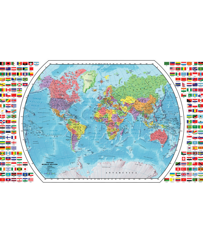 The Replogle World Map is easy to read and is an essential learning tool for the home and classroom. This map is beautifully framed by all the corresponding flags of the word. All colors on the map correspond and match the colors on Replogle educational globes to help reinforce geographic location learning. The map measures 49"W x 33"H.