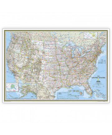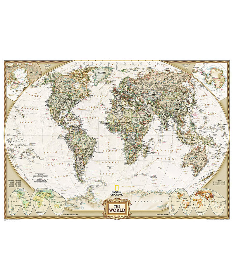 Expertly researched and designed, National Geographic's World Wall Map is the authoritative map of the world by which other reference maps are measured. Antique-style "executive" color palette. Background shows mountain ranges and valleys in subtle shaded relief with mountain ranges labeled. Major water bodies including rivers, lakes, glaciers, oceans, seas, gulfs, bays, straits, and bathymetry. Clearly defined international boundaries, cities, islands, airports, and physical features. Thousands of place names carefully and artfully placed to maintain legibility in heavily populated areas. Up-to-date international boundaries and territorial control reflect de facto status on the ground. Meticulously researched using multiple authoritative sources including the U.N., U.S. Board on Geographic Names, and policies of individual governments. Accurate place names use a combination of conventional English names, official national names, and standard transliterations for non-Latin alphabets. Drawn in Winkel Tripel projection with distortions minimized unlike other World maps (e.g. Greenland is shown the same size as Argentina, not South America). Corner inset maps feature vegetation, land use, population density, and north and south polar regions. Mural maps are printed on a tear-resistant, coated paper for strength, color protection, and long life. The coating resists dirt and dust and may be cleaned with a slightly dampened cloth. The mural can be hung using heavy duty (clay based) wallpaper paste.