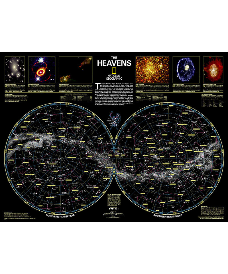 - National Geographic's The Heavens shows star charts and constellations for both the Northern and Southern Hemispheres.