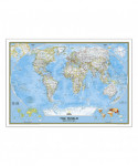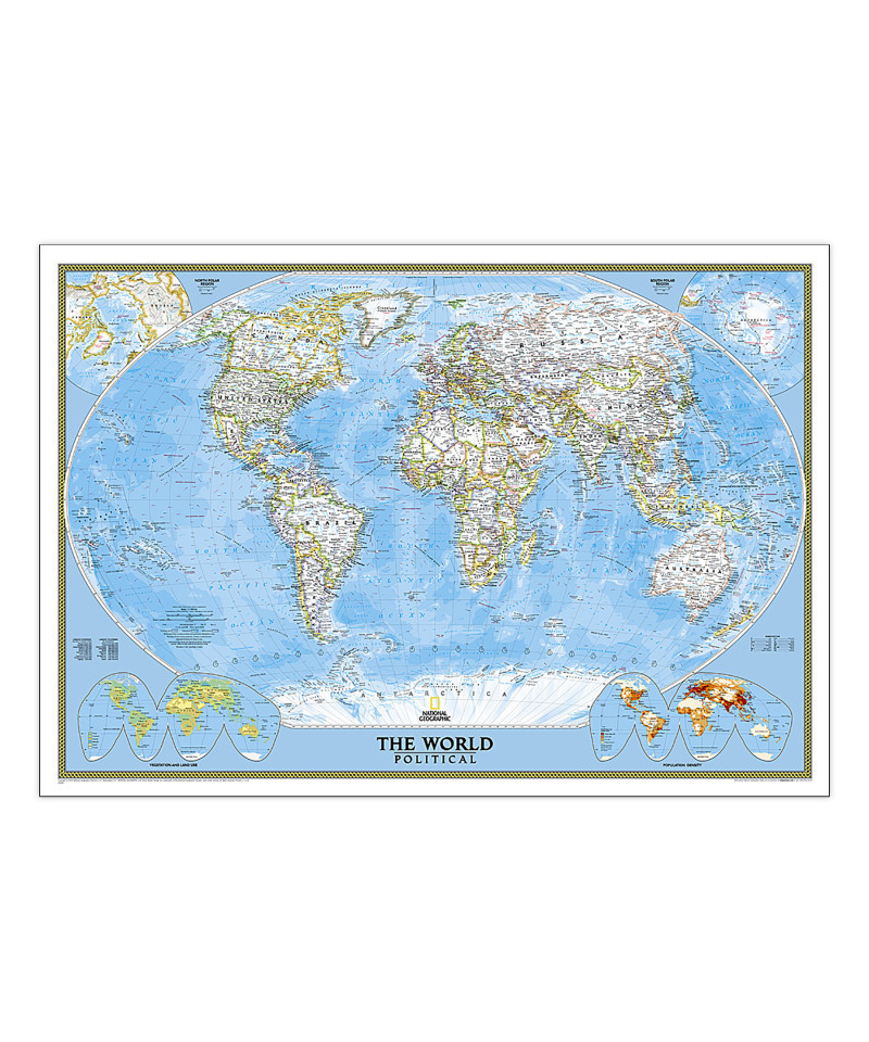Expertly researched and designed, National Geographic's World Wall Map is the authoritative map of the world by which other reference maps are measured. Signature Classic style map with bright, easy to read color palette with blue oceans and colorful borders. Background shows mountain ranges and valleys in subtle shaded relief with mountain ranges labeled. Major water bodies including rivers, lakes, glaciers, oceans, seas, gulfs, bays, straits, and bathymetry. Clearly defined international boundaries, cities, islands, airports, and physical features. Thousands of place names carefully and artfully placed to maintain legibility in heavily populated areas. Up-to-date international boundaries and territorial control reflect de facto status on the ground. Meticulously researched using multiple authoritative sources including the U.N., U.S. Board on Geographic Names, and policies of individual governments. Accurate place names use a combination of conventional English names, official national names, and standard transliterations for non-Latin alphabets. Drawn in Winkel Tripel projection with distortions minimized unlike other World maps (e.g. Greenland is shown the same size as Argentina, not South America). Corner inset maps feature vegetation, land use, population density, and north and south polar regions. The map is encapsulated in heavy-duty 1.6 mil laminate which makes the paper much more durable and resistant to the swelling and shrinking caused by changes in humidity. Laminated maps can be framed without the need for glass, so the frames can be much lighter and less expensive.