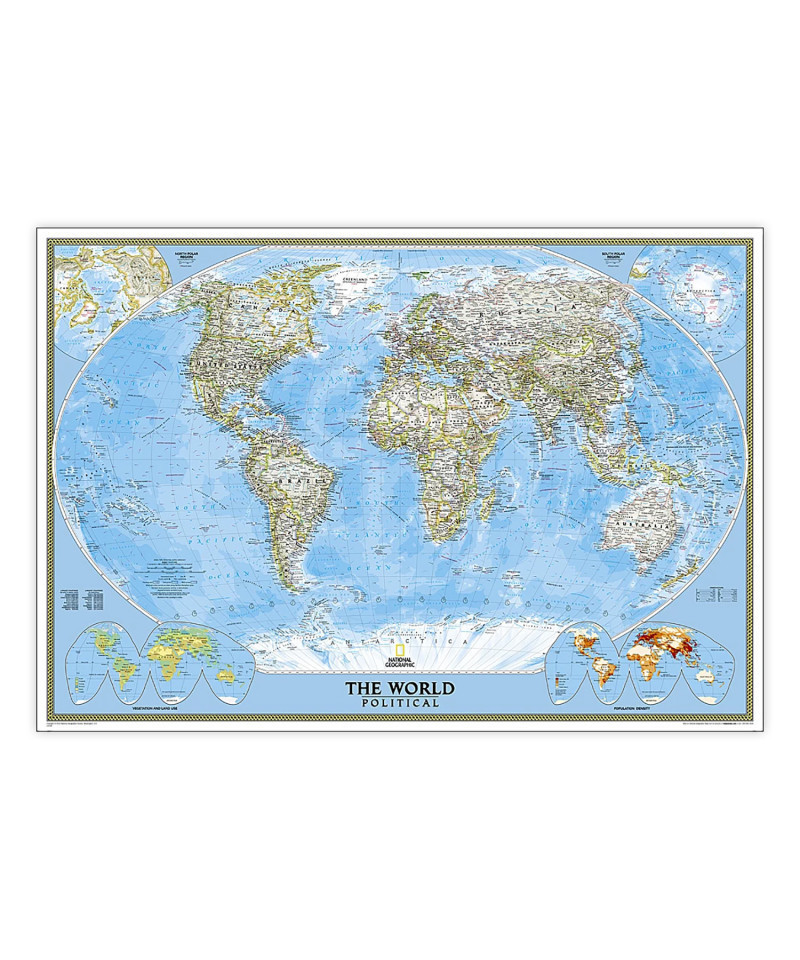 Expertly researched and designed, National Geographic's World Wall Map is the authoritative map of the world by which other reference maps are measured. Signature Classic style map with bright, easy to read color palette with blue oceans and colorful borders. Background shows mountain ranges and valleys in subtle shaded relief with mountain ranges labeled. Major water bodies including rivers, lakes, glaciers, oceans, seas, gulfs, bays, straits, and bathymetry. Clearly defined international boundaries, cities, islands, airports, and physical features. Thousands of place names carefully and artfully placed to maintain legibility in heavily populated areas. Up-to-date international boundaries and territorial control reflect de facto status on the ground. Meticulously researched using multiple authoritative sources including the U.N., U.S. Board on Geographic Names, and policies of individual governments. Accurate place names use a combination of conventional English names, official national names, and standard transliterations for non-Latin alphabets. Drawn in Winkel Tripel projection with distortions minimized unlike other World maps (e.g. Greenland is shown the same size as Argentina, not South America). Corner inset maps feature vegetation, land use, population density, and north and south polar regions. Enlarged maps provide an immersive experience in any home or office environment. The exceptional cartography is even easier to appreciate at the larger size. The map is encapsulated in heavy-duty 1.6 mil laminate which makes the paper much more durable and resistant to the swelling and shrinking caused by changes in humidity. Laminated maps can be framed without the need for glass, so the frames can be much lighter and less expensive.