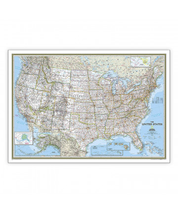 Expertly researched and designed, National Geographic's World Wall Map is the authoritative map of the world by which other reference maps are measured. Antique-style "executive" color palette. Background shows mountain ranges and valleys in subtle shaded relief with mountain ranges labeled. Major water bodies including rivers, lakes, glaciers, oceans, seas, gulfs, bays, straits, and bathymetry. Clearly defined international boundaries, cities, islands, airports, and physical features. Thousands of place names carefully and artfully placed to maintain legibility in heavily populated areas. Up-to-date international boundaries and territorial control reflect de facto status on the ground. Meticulously researched using multiple authoritative sources including the U.N., U.S. Board on Geographic Names, and policies of individual governments. Accurate place names use a combination of conventional English names, official national names, and standard transliterations for non-Latin alphabets. Drawn in Winkel Tripel projection with distortions minimized unlike other World maps (e.g. Greenland is shown the same size as Argentina, not South America). Corner inset maps feature vegetation, land use, population density, and north and south polar regions. The map is encapsulated in heavy-duty 1.6 mil laminate which makes the paper much more durable and resistant to the swelling and shrinking caused by changes in humidity. Laminated maps can be framed without the need for glass, so the frames can be much lighter and less expensive.
