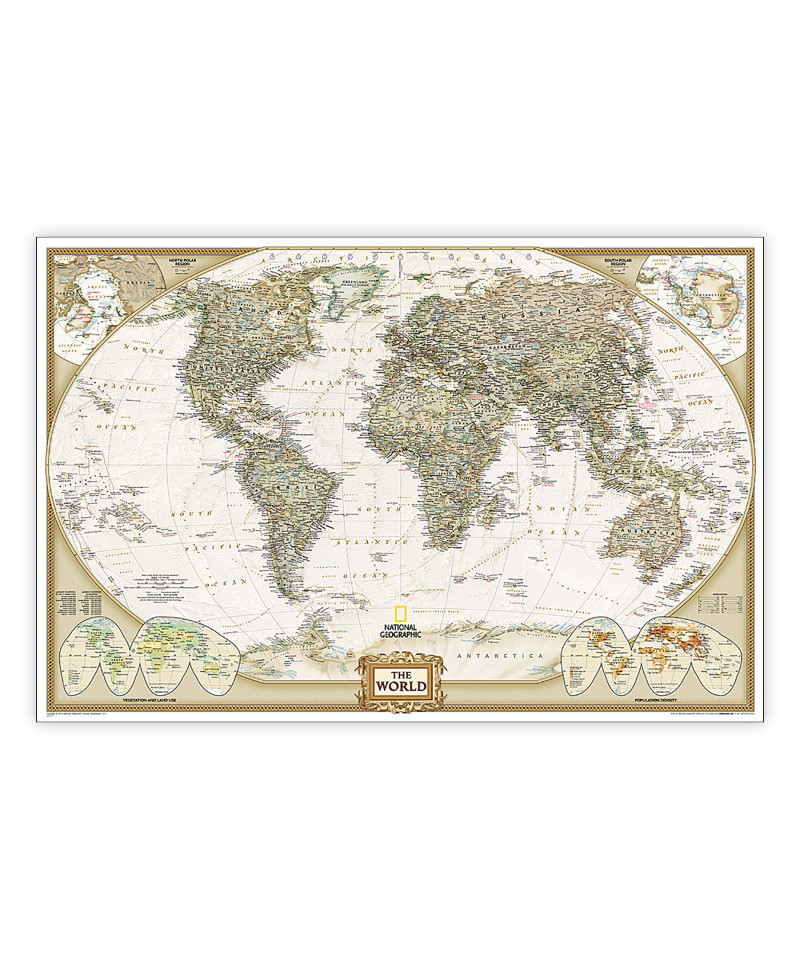 Expertly researched and designed, National Geographic's World Wall Map is the authoritative map of the world by which other reference maps are measured. Antique-style "executive" color palette. Background shows mountain ranges and valleys in subtle shaded relief with mountain ranges labeled. Major water bodies including rivers, lakes, glaciers, oceans, seas, gulfs, bays, straits, and bathymetry. Clearly defined international boundaries, cities, islands, airports, and physical features. Thousands of place names carefully and artfully placed to maintain legibility in heavily populated areas. Up-to-date international boundaries and territorial control reflect de facto status on the ground. Meticulously researched using multiple authoritative sources including the U.N., U.S. Board on Geographic Names, and policies of individual governments. Accurate place names use a combination of conventional English names, official national names, and standard transliterations for non-Latin alphabets. Drawn in Winkel Tripel projection with distortions minimized unlike other World maps (e.g. Greenland is shown the same size as Argentina, not South America). Corner inset maps feature vegetation, land use, population density, and north and south polar regions. The 36" x 24" poster size supports easy and affordable framing and mounting, and takes less wall space than standard wall maps. The map is encapsulated in heavy-duty 1.6 mil laminate which makes the paper much more durable and resistant to the swelling and shrinking caused by changes in humidity. Laminated maps can be framed without the need for glass, so the frames can be much lighter and less expensive.
