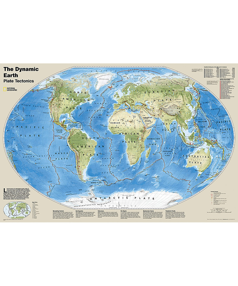 - National Geographic Dynamic Earth, Plate Tectonics Wall Map illustrates plate tectonics and features stunning bathymetry and naturally colored relief, as well as volcano and earthquake data through 2011.
