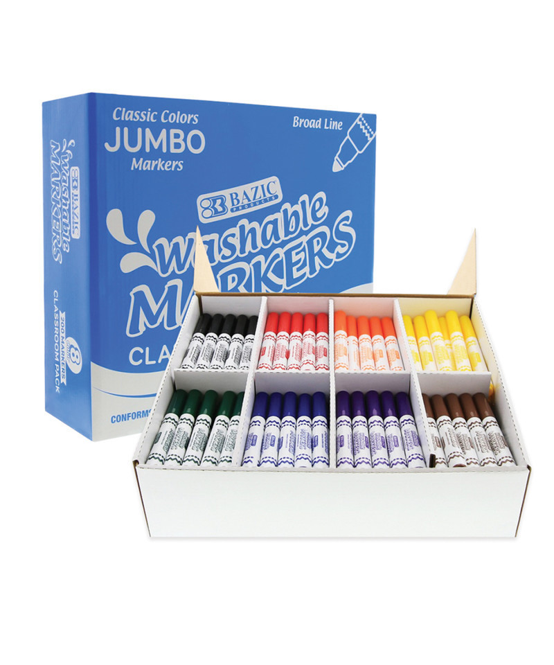 This classroom pack of broad line washable markers are perfect for coloring and drawing. Each pack includes 200 markers, 25 each of 8 colors: red, orange, yellow, green, blue, purple, brown, and black. It also comes with 12 clear caps on the side, handy for replacement when caps are lost. Conical fiber tips (like a cone shape) allow the artist to draw fine line when using the tip in vertical angle, and broad line when using the tip in tilted angles. Wash & Care tips: most clothing can be washed in warm or hot water. Do not use pre-wash or chlorine bleach, repeat laundering if necessary.
