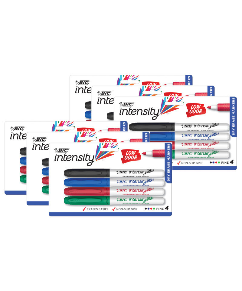The BIC Great Erase Low Odor Dry Erase Marker provides smooth ink flow and bold color on dry erase boards and most non-porous surfaces. This ACMI-approved low odor dry erase marker is non-toxic and features a fine point for detailed writing. The vivid color wipes away easily with a cloth, tissue, or felt eraser with minimal ghosting. Each pack contains 4 assorted dry erase markers--black, blue, red, and green--great for home, school, or the office. Sold as 6 packs for a total of 24 markers.