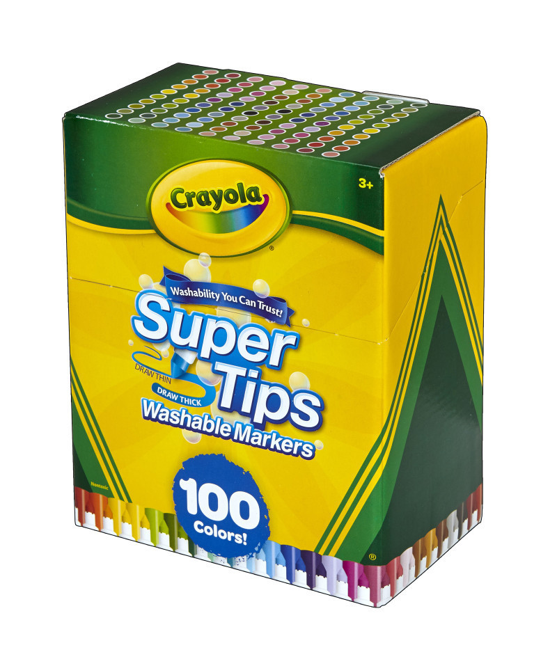 Crayola Washable Super Tips Markers feature a cool drawing tip that can make both thick and thin lines. Specially formulated, the Crayola markers wash from skin as well as most fabrics used in children's clothing. Non-toxic. Pack of 100 markers.