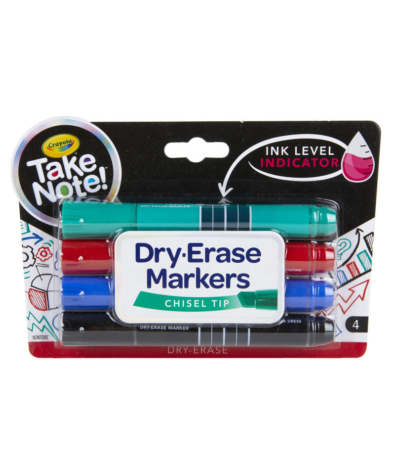 Crayola Take Note Dry-Erase Markers are quick to dry but easy to erase! Vibrant colors are great for bold messages on most white boards. Each marker has a chisel tip that is perfect for thick or thin lines and features an ink level indicator so you always know when it's time to restock. The markers are low odor, making them ideal for classrooms, offices, and meeting rooms. Includes 4 Crayola Take Note Dry Erase Markers in Black, Blue, Red, & Green