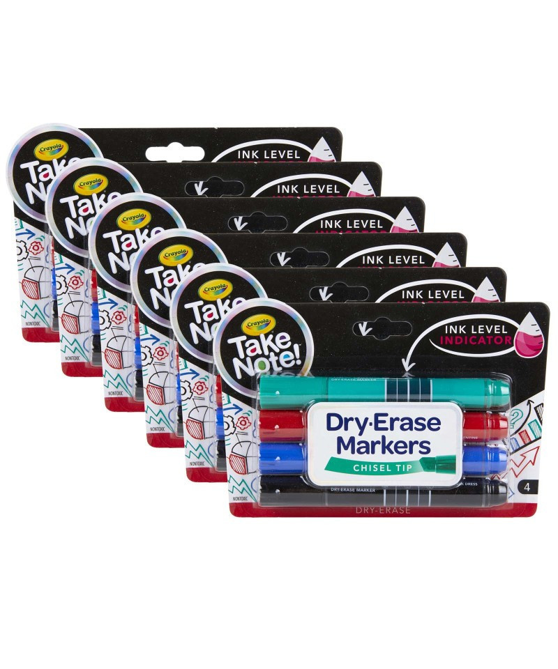 Crayola Take Note Dry-Erase Markers are quick to dry but easy to erase! Vibrant colors are great for bold messages on most white boards. Each marker has a chisel tip that is perfect for thick or thin lines and features an ink level indicator so you always know when it's time to restock. The markers are low odor, making them ideal for classrooms, offices, and meeting rooms. Each pack includes 4 Crayola Take Note Dry Erase Markers in Black, Blue, Red, and Green. Sold as 6 packs for a total of 24 markers.