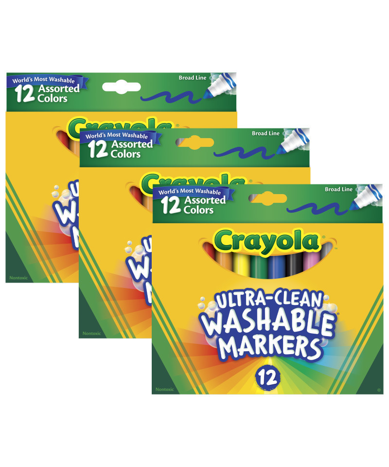Kids love to get creative with color, but parents want to keep the color where it belongs and easily remove it where it doesn't! The world's most washable non-toxic markers now come in an improved Ultra-Clean formula that washes easily from skin, clothing, and common household surfaces—even painted walls. Classic Broad Line Markers provide artists with classic Crayola colors that feature Color Max, our most vibrant color yet. Amp up school projects and artistic endeavors with high-quality ink that is true to color. The variety of bright colors in this pack invites imaginative expression. With its conical tip, the Classic Broad Line Marker is a versatile drawing tool. Perfect for coloring in large areas, these markers are also great for drawing thin lines or dots. Kids can even create a ribbon effect with lines that taper from thick to thin. Broad line markers lay down plenty of color and won't smudge or bleed through paper. Crayola Markers contain recycled resin, which puts over a million pounds of plastic back to use. Bring beauty and color to your world and help keep plastic out of landfills. Each box includes 12 Ultra-Clean Washable Broad Line Markers in assorted colors and peggable box. Sold as 3 boxes for a total of 36 markers.