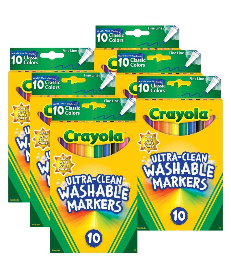 Kids love to get creative with color, but parents want to keep the color where it belongs and easily remove it where it doesn't! Crayola Ultra-Clean Fine Line Bold Markers now have an improved Ultra-Clean washable formula and come with two new bold colors. These durable fine-line markers are ideal for writing, drawing, or coloring in small areas. Fine Line Markers provide artists with classic Crayola colors that feature Color Max – our brightest, truest colors yet. Amp up school projects and artistic endeavors with high-quality ink that is true to color. The variety of bright, classic colors in this pack invites imaginative expression. With its slender tip, the Fine Line Marker is a precise drawing tool. Perfect for coloring in small areas, these markers are also great for writing or drawing thin lines or dots. These markers lay down plenty of vibrant color and won't smudge or bleed through paper. The world's most washable non-toxic markers now come in an improved Ultra-Clean formula that washes easily from skin, clothing, and common household surfaces—even painted walls. Each pack includes 10 markers. Sold as 6 packs for a total of 60 markers.