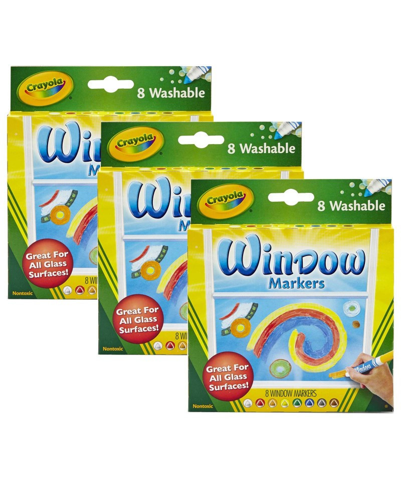 Write messages on the inside of your windows - try writing backwards if you want them to be read outside. No worries if you make a mistake because you can always wash it off and start again. Have fun decorating mirrors by drawing pretty designs around the edges, just like a picture frame. Or you could design on the outside of a glass vase to match your fresh flowers. Look around the house for more great surfaces to decorate with Crayola Washable Window Markers. Each pack includes 8 Crayola Washable Window Markers including primary, secondary and neutral colors. Sold as 3 packs for a total of 24 markers.