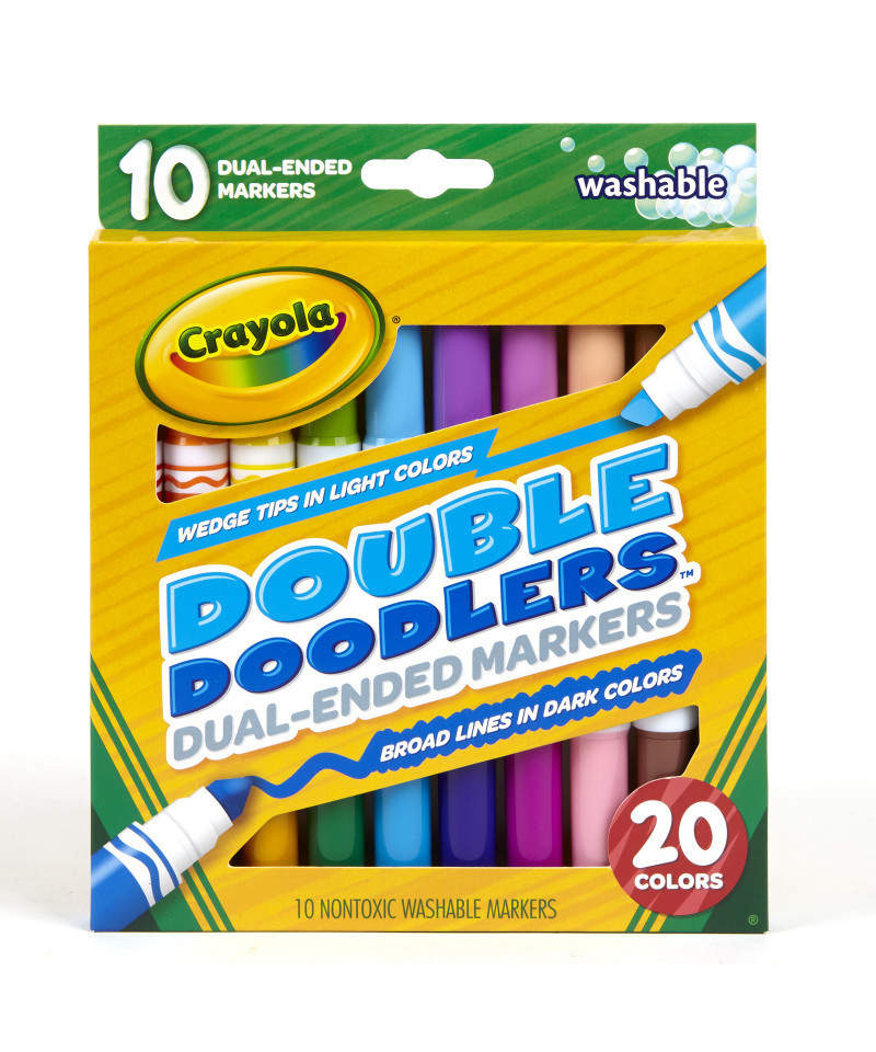 Total of 20 colors, with tips that provide just the right amount of color for large or small spaces! Strong and durable marker tips wear well for coloring and projects. Trusted washability, easily washing from skin and clothing. Each pack includes 10 Dual-ended markers.