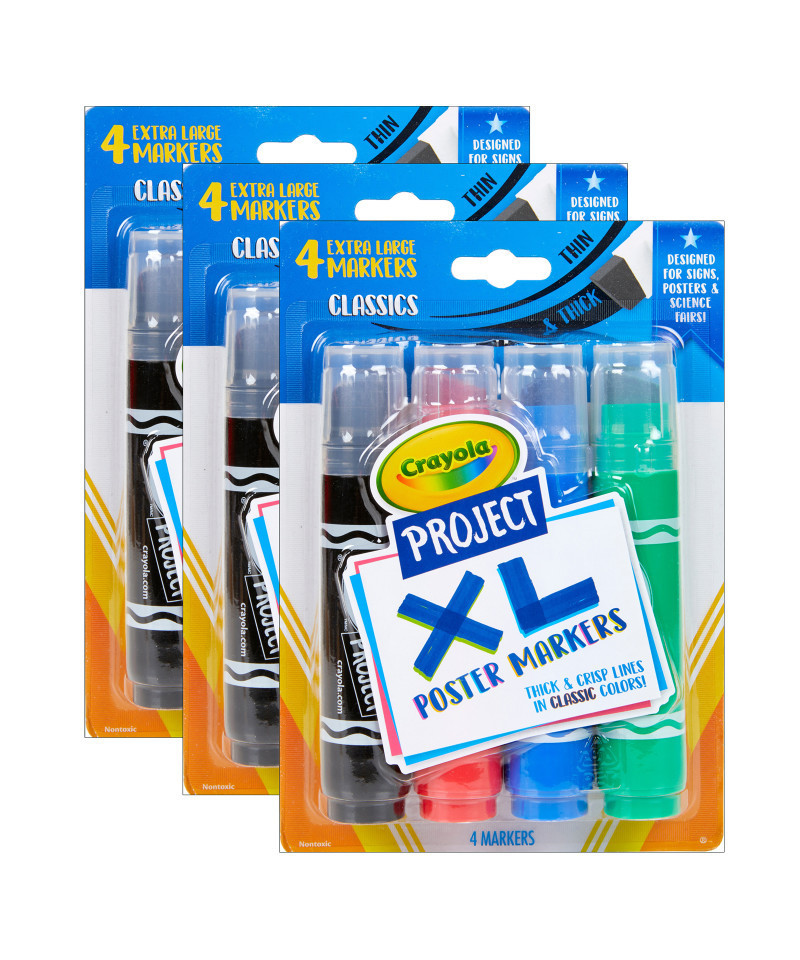 From the Crayola Project line, these supersized markers are perfect for a variety of full-coverage art projects and crafts. Create super thick lines with these bold, extra-wide chisel tips. School projects, presentations, posters, signs and decorations stand out with crisp, wide lines in classic colors. Ideal for adults and kids, ages 6 and up. Each set includes 4 XL Poster Markers in classic colors: Black, Green, Blue, and Red. Sold as 3 packs for a total of 12 markers.