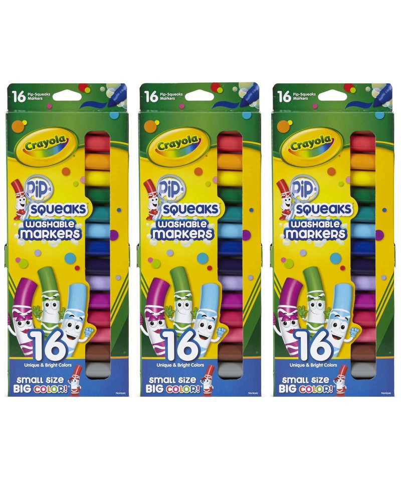 Endearing Pip-Squeaks Markers are small in size, but BIG in color! The easy-to-hold short barrels are scaled to match little hands and the ink is our special washable formula! These scaled-down Pip-Squeaks markers provide children with a good introduction to the fun world of coloring. Pip-Squeaks markers are made specifically for kids, so they're non-toxic and fun to use. Moms will love the fact that the colors wash off skin and can be easily cleaned from most kids' clothing fabrics. Each pack includes 16 Crayola washable markers in unique and bright colors. Sold as 3 packs, 48 markers total.