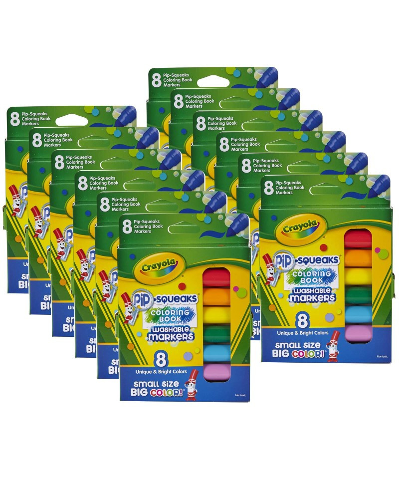 Endearing Pip-Squeaks Markers are small in size, but BIG in color! The easy-to-hold short barrels are scaled to match little hands and the ink is our special washable formula! Features unique colors - not the traditional "school" palette of colors. Each pack includes 8 short, washable coloring book markers. Sold as 12 packs for a total of 96 markers.