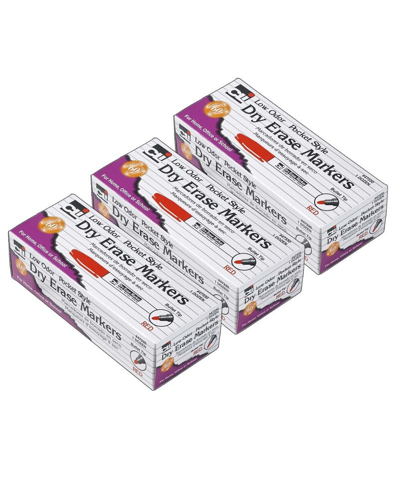 Charles Leonard Dry Erase Markers, Low Odor, Pocket Style, Bullet Tip, Red, 12 Per Box, 3 Boxes