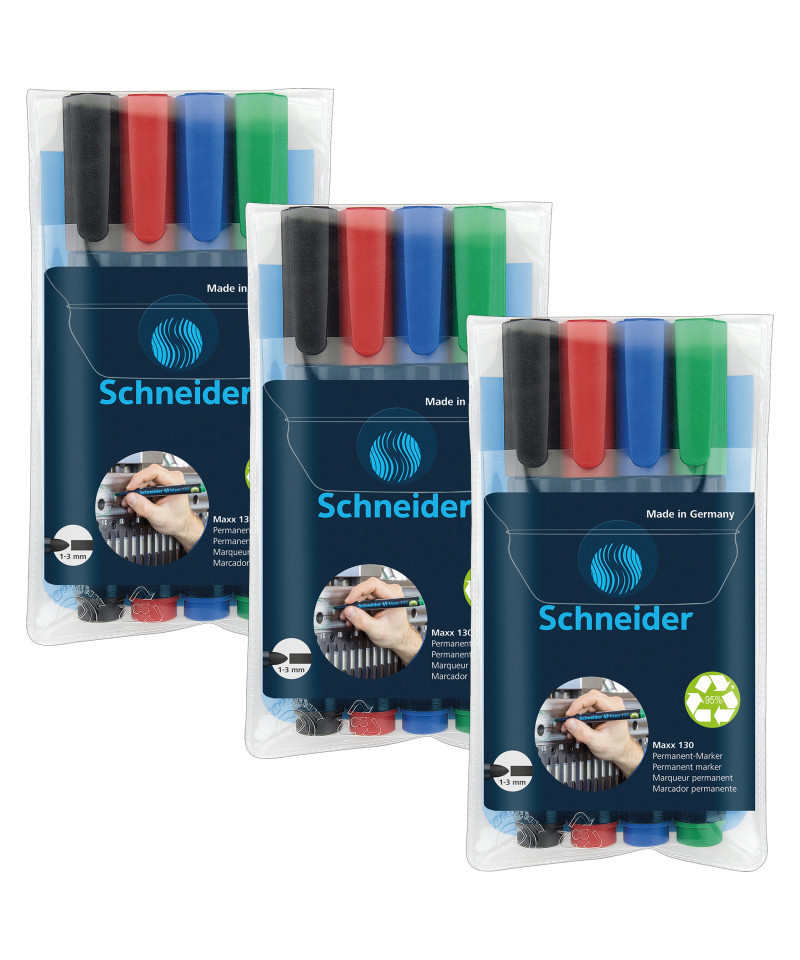 The Schneider Maxx 130 is a permanent marker for writing on almost all types of materials. It has a low odor and is free of toluol and xylol. The bullet tip writes in two line widths, 1 & 3 mm. With its quick-drying, waterproof, and highly light-resistant format, the Maxx 130 will not dry out, even if the cap is left off for 2-3 days. The Schneider Maxx 130 has a practical clip cap and can be refilled using Maxx 640 refill station. Housing made of 95% recycled plastic and made in Germany. Each pack includes 4 markers of assorted ink colors: Black, Red, Blue and Green. Sold as 3 packs for a total of 12 markers.