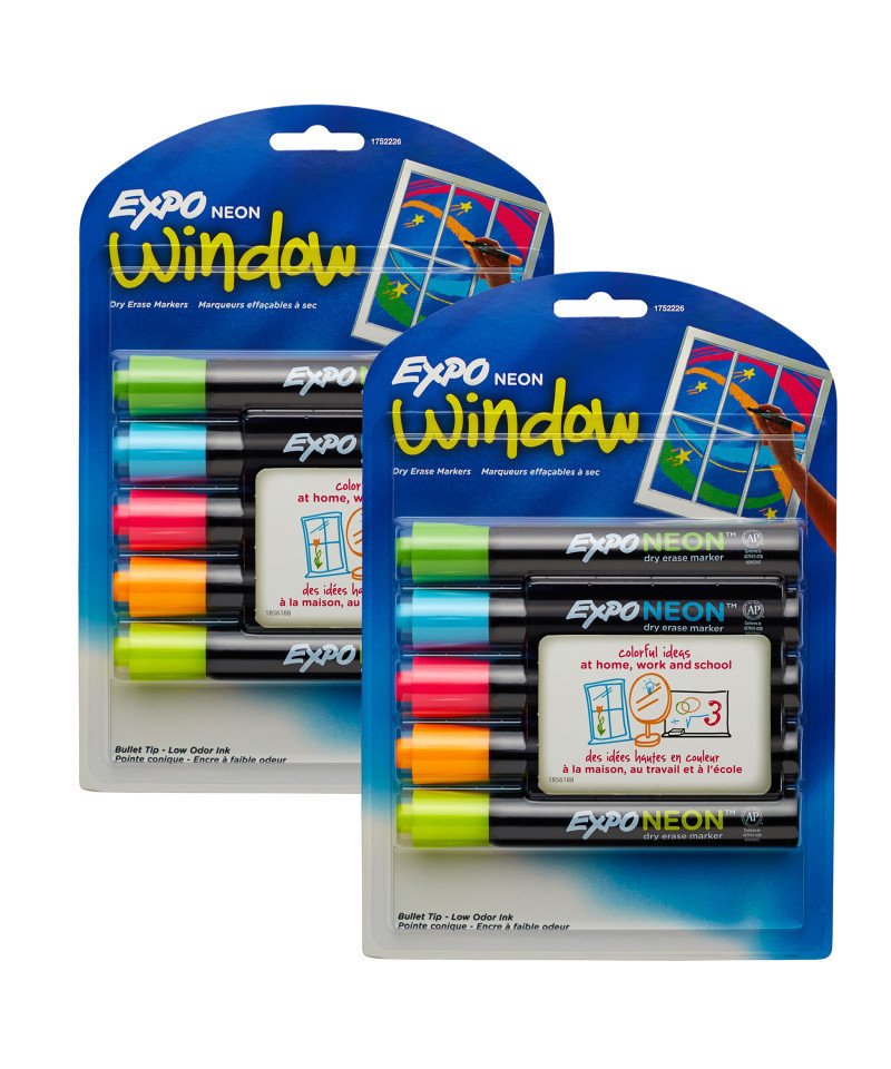 Expo Neon markers can be used on both black and white dry erase surfaces, and the brilliant Expo colors are visible from a distance. The ink is ideal for use in both the classroom and the kitchen. Certified AP Non-toxic ink conforms to ASTM D-4263. Package contains 5 markers: 1 each of pink, orange, and yellow, green, and blue. Sold as 2 packs for a total of 10 markers.