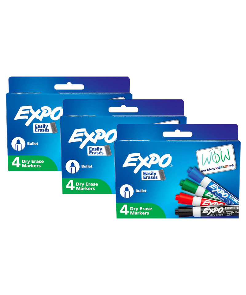 Dry-erase markers without the strong odor. Goes on wet, dries instantly and wipes off easily with a dry tissue or Expo eraser. Use on erasable marker boards, glass, unpainted metal and glazed ceramics. Certified AP nontoxic. Pack of 4 assorted colors. Sold as a set of 3 packs, 12 markers total.