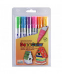 Use these DecoColor® Broad Point paint marker pen to write out large messages on glass or mirrors or to cover a larger surface area on other projects. The larger tip of this paint pen allows for a quick covering of any glass, paper, wood, clay, porcelain, stone, metal, or mirror surface. The paint is acid-free, lightfast, weatherproof, and pigmented. Each pack includes 6 markers, 1 each of yellow, orange, light blue, light green, rosemarie, and hot purple.