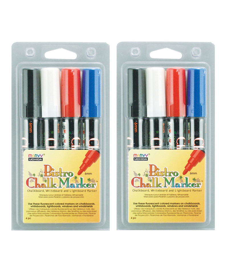Bistro Chalk Markers are the perfect every day chalk marker. These chalk markers work on chalkboards, dry erase boards, light boards, windows, windshields, and other non-porous surfaces so you can write or create art virtually anywhere. These markers come in 19 colors and are opaque, water-based, and pigmented. Clean up is super easy, they are erasable with a damp cloth. Each pack includes 4 markers with a 6 mm point tip: white, red, blue, and black. Sold as 2 packs for a total of 8 markers.