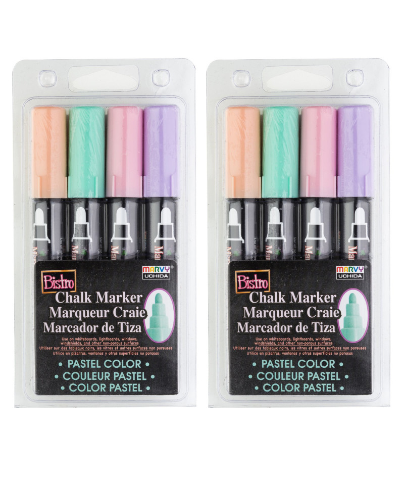 Use Bistro Chalk Markers on chalkboards, light boards, windows, and most non-porous surfaces. A wonderful way to create chalkboard art to attract attention. They are opaque, water based, pigmented, erasable with a damp cloth. Each pack includes 4 markers: pale violet, peppermint, blush pink and pastel peach. Sold as 2 packs for a total of 8 markers.