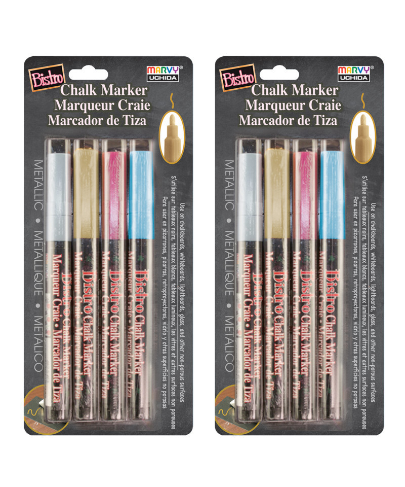 Use Metallic Bistro Chalk Markers on seasoned chalkboards, light boards, dry erase boards, mirrors, windows, windshields and most non porous surfaces. These Metallic Chalk Markers are a great way to add metallic colors to your chalk creations. These great markers are opaque, water based, pigmented and erasable with a damp cloth. Each Bistro Chalk Marker Fine Point Metallic Set includes 4 colors: Gold, Silver, Metallic Red, Metallic Blue. Sold as 2 sets for a total of 8 markers.