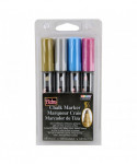 Use Metallic Bistro Chalk Markers on seasoned chalkboards, light boards, dry erase boards, mirrors, windows, windshields and most non porous surfaces. These Metallic Chalk Markers are a great way to add metallic colors to your chalk creations. These great markers are opaque, water based, pigmented and erasable with a damp cloth. Each pack includes 4 markers: gold, silver, metallic red and metallic blue.