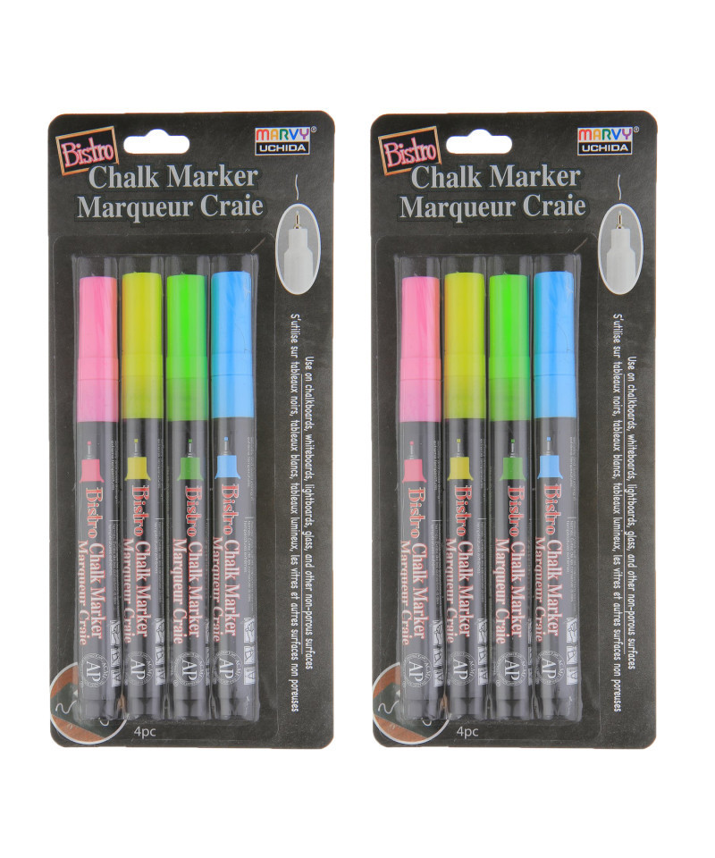 Use extra fine point Bistro Chalk Markers on chalkboards, light boards, windows, windshields, and most non-porous surfaces. A wonderful way to create chalkboard art to attract attention and increase sales. They are opaque, water based, pigmented, and erasable with a damp cloth. Each pack includes 4 markers: fluorescent pink, fluorescent blue, fluorescent green, and fluorescent yellow. Sold as 2 sets for a total of 8 markers.
