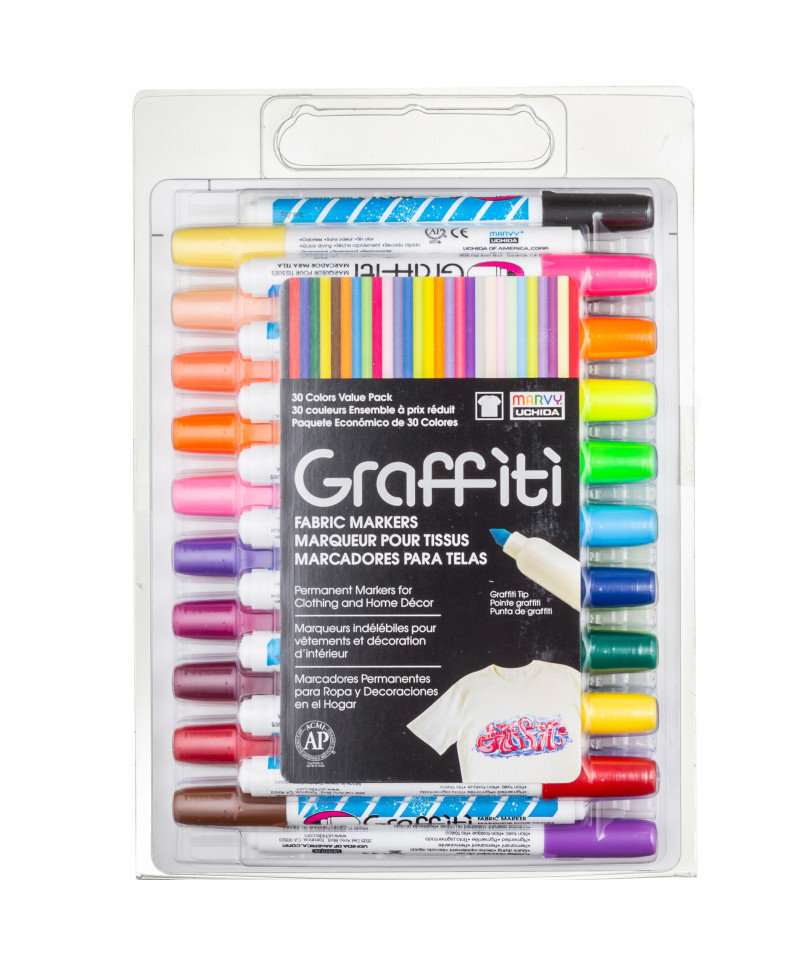 The Graffiti Fabric Markers are the ideal marker to use for light colored fabric. This fabric marker pen has a tapered medium tip allowing for a variety of thickness. Easily create costumes, personalized attire, and gifts with the Graffiti Fabric Markers. Super easy prep and clean up with no prewashing necessary. Ink is acid-free, non-toxic, and pigmented.