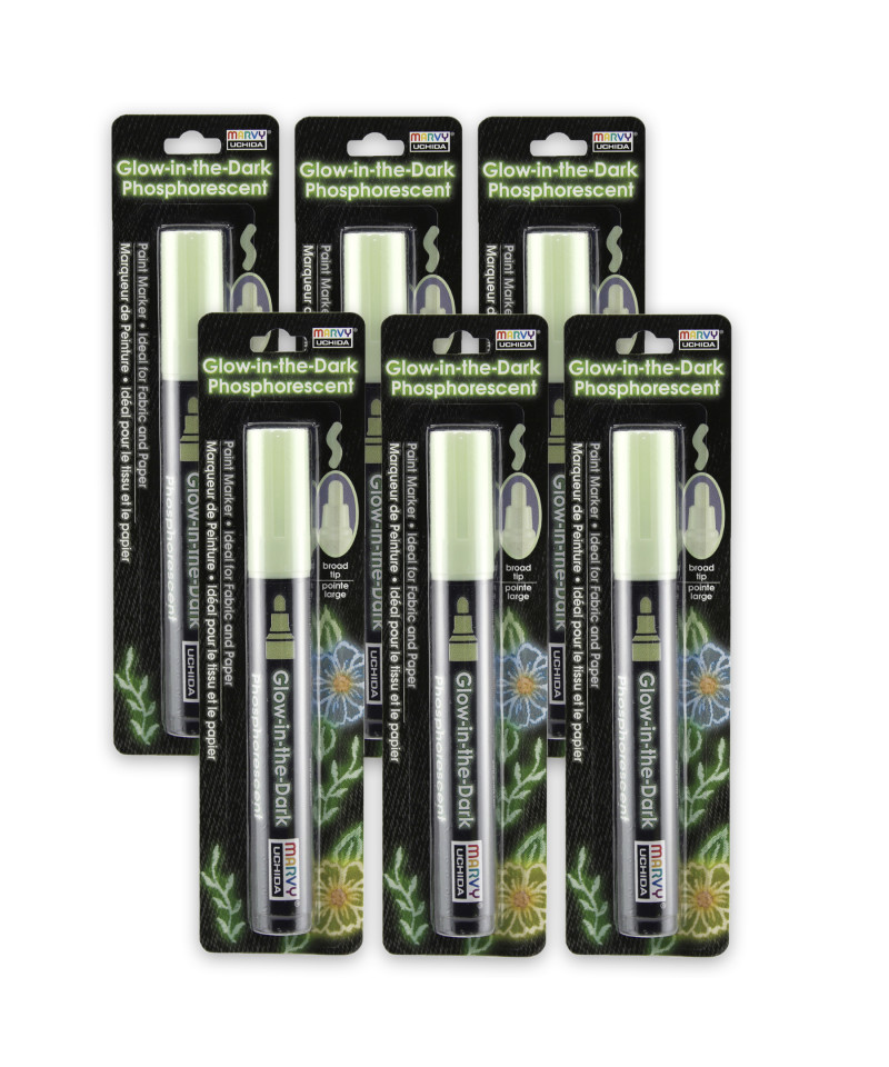This Glow in the Dark Fabric Marker is perfect for so many projects. Use it to make unique costumes, fun camp shirts, and decorations. The fabric marker is also great for other crafts. Use it to decorate backpacks, sleeping bags, t-shirts, pajamas. The markers also work on paper. When dry expose the area to light to make it glow. Heat setting recommended. Sold as a pack of 6 markers.