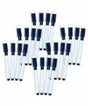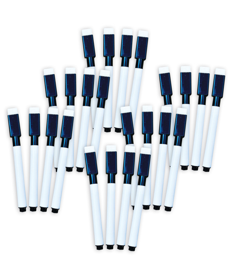 Fine point dry erase markers easily clean and wipe from any dry erase surface. The cap has an eraser attached for easy removable of ink from all dry erase surfaces. Perfect for travel and classroom work. Each pack includes 4 black dry erase markers. Sold as 6 packs for a total of 24 markers.