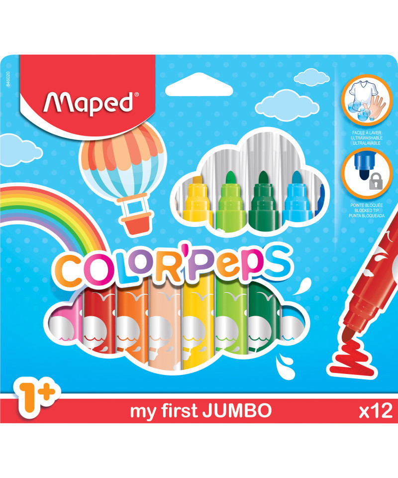 Color'Peps My First Safety Tip Ultrawashable Markers feature bright and fun Ultrawashable ink that is super easy to clean up! The unique 5mm Safety Tip is securely locked into the marker body, stopping children from crushing or removing it. With clear ventilated caps, these markers are perfect for young students learning to color and draw. Ultrawashable ink is super easy to remove from most fabrics and surfaces with warm soap and water, making cleanup a snap! This pack includes the following 12 colors: Dark Black, Ultra Violet, Lovely Pink, Red Kiss, Fruity Orange, Blush, Sunny Yellow, Apple Green, Green Golf, Bubble Blue, Marina Blue and Woody Brown.