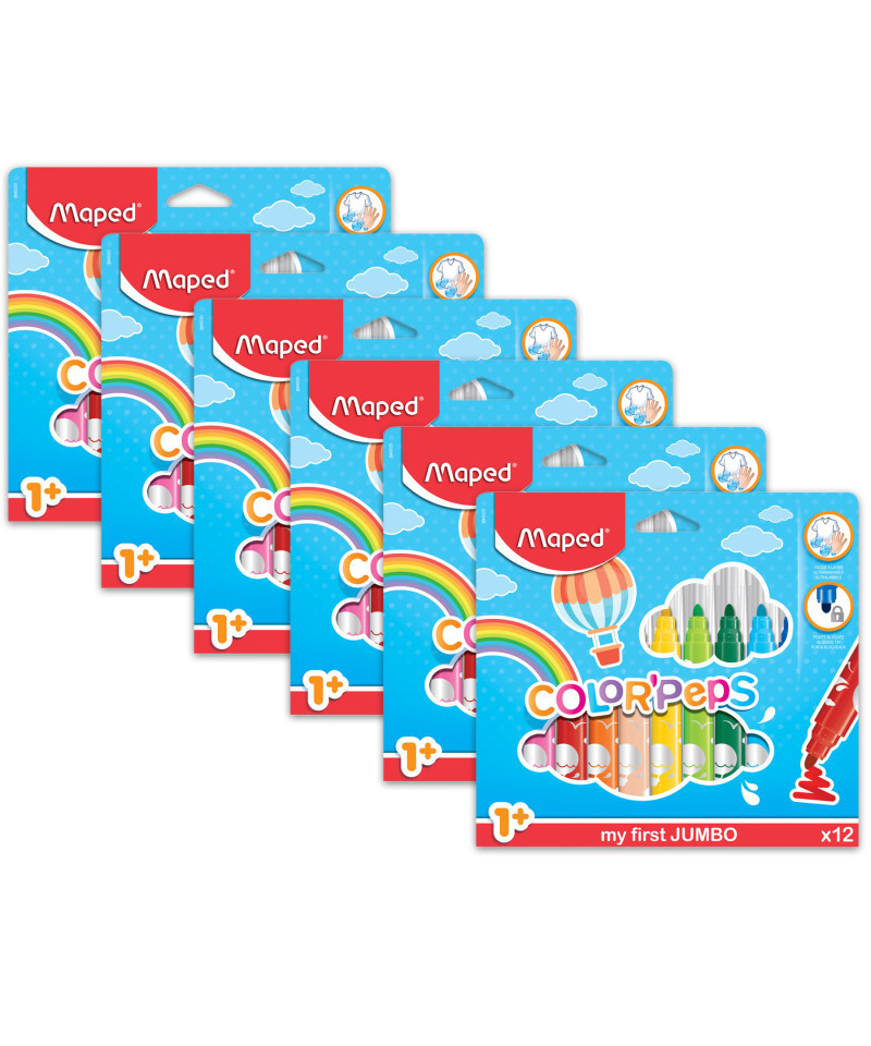 Color'Peps My First Safety Tip Ultrawashable Markers feature bright and fun Ultrawashable ink that is super easy to clean up! The unique 5mm Safety Tip is securely locked into the marker body, stopping children from crushing or removing it. With clear ventilated caps, these markers are perfect for young students learning to color and draw. Ultrawashable ink is super easy to remove from most fabrics and surfaces with warm soap and water, making cleanup a snap! Each pack includes the following 12 colors: Dark Black, Ultra Violet, Lovely Pink, Red Kiss, Fruity Orange, Blush, Sunny Yellow, Apple Green, Green Golf, Bubble Blue, Marina Blue and Woody Brown. Sold as 6 packs for a total of 72 markers.