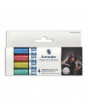 The Schneider Paint-It 010 Metallic Markers feature extraordinary, eye-catching effects. Pigment technology enables a clean and homogenous color application. Aluminum flakes coated with color pigments produce a highly metallic effect with an exceptionally high-opacity, high-gloss level, even in different incidences of light. Line width approximately 0.8 mm. Metallic ink color assortment in a wallet of four (4) includes one each of: Blue, Red, Yellow and Green Metallic. The cap color indicates the ink color. Fast-drying, valve-controlled ink makes the marker ideal for creative projects. Shake the marker, remove the cap, and activate it by pushing (pumping) the writing tip onto a solid surface. Optimized on non-absorbent surfaces and show best results. Suitable for use with many materials including: glass, metal, plastic, porcelain, stone, cardboard, paper, and more. To ensure longevity, store horizontally.