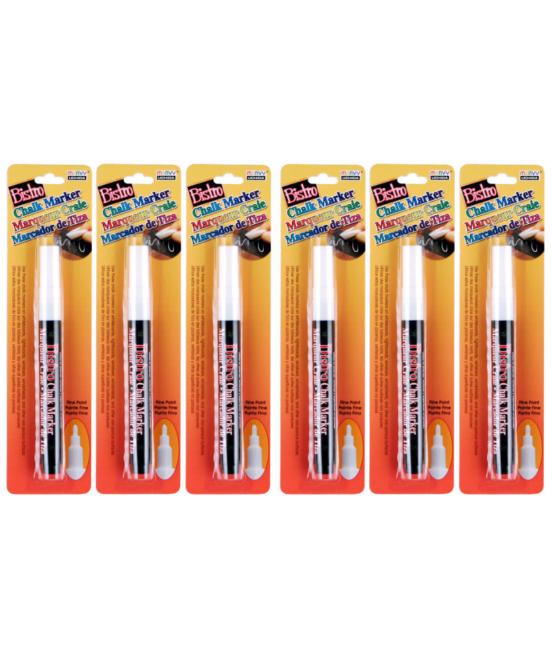 Use fine point Bistro Chalk Markers on chalkboards, light boards, windows, windshields, and most non-porous surfaces. A wonderful way to create chalkboard art to attract attention and increase sales. They are opaque, water based, pigmented, erasable with a damp cloth. 3mm fine point tip. Sold as a pack of 6.